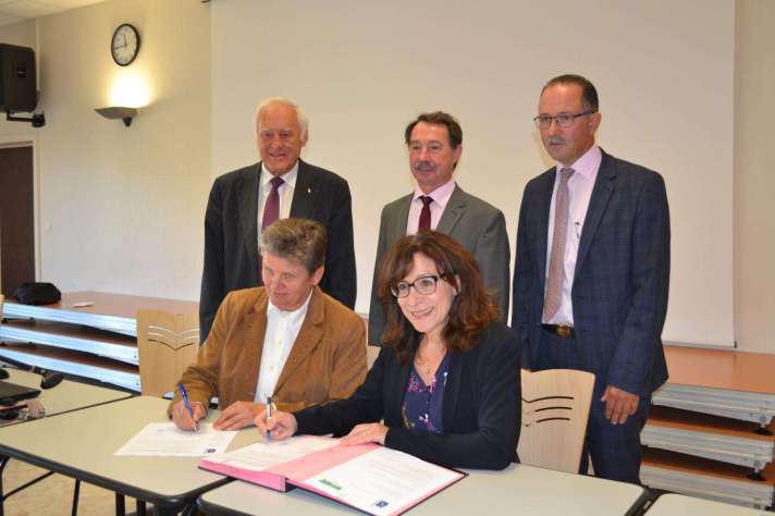 MMe Hamman, Proviseur (à droite) et MMe Kuntz, Présidente de l’association du 3ème âge de Bitche (à gauche) signent le partenariat, en présence de M Humbert, Maire de Bitche, M Salin Sous-Préfet de l’arrondissement de Sarreguemines et M Vogt, Président de la Communaute de Communes du Pays de Bitche (de gauche à droite)